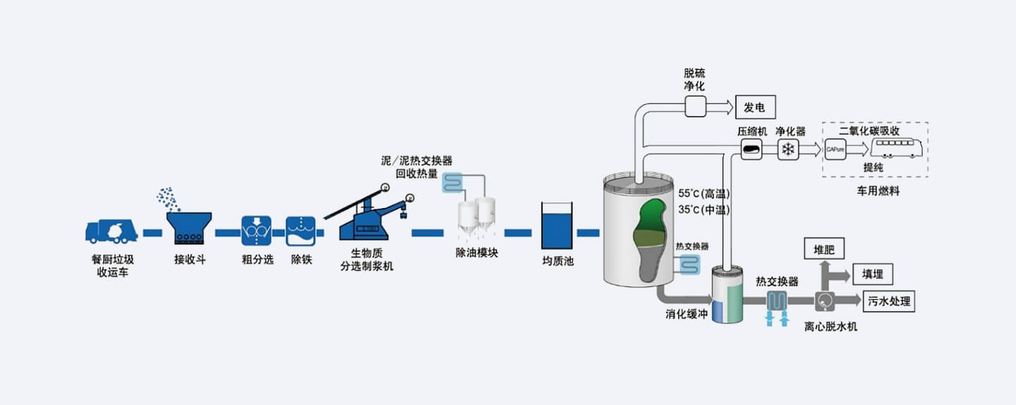 餐厨垃圾处理主工艺流程为餐厨垃圾先经过粗分选、破碎制浆除杂、除油后制成浆液,送至厌氧处理单元。浆液在一定温度(高温55±2℃,中温为37±2 ℃摄氏度)条件下在厌氧反应器内完成消化分解,有机质在厌氧罐中被分解并生成沼气,沼气可进一步提纯净化,用来发电或做为车用燃料。厌氧消化后产生的沼液送至后续水处理单元,处理后达标排放。产生的沼渣经干化或堆肥后进行资源化利用。过程中分离出的砂石、玻璃和陶瓷等重物质以及纤维、织物和塑料等杂质被焚烧或填埋。