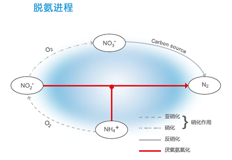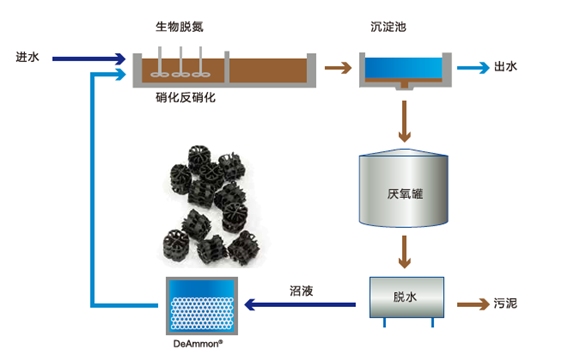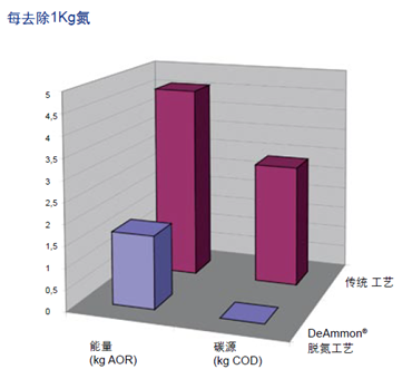 DeAmmon®脱氮工艺是专门针对高氨氮污水研发的技术,如消化污泥的脱水上清液和高氨氮工业废水。与其它传统脱氮工艺相比,DeAmmon®脱氮工艺的显著优势是耗氧量极低,并且无需补充碳源。此工艺可以方便地应用于现有污水厂的改造。